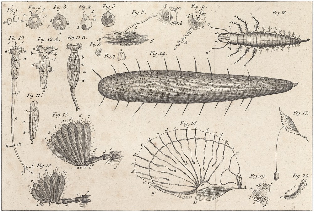 Animalcules microscopiques observés par Goeze, parmi lesquels est illustré un animalcule en division (fig. 7a). Planche extraite de Goeze (Johann August Ephraim), « Anhang einiger Beobachtungen des Uebersetzers über verschiedene wichtige mikroskopische Gegenstände aus der Insektologie, und Helminthologie », in Bonnet (Charles), Abhandlungen aus der Insektologie [trad. Goeze Johann], Halle : Gebauer, 1774, pp. 417-578, pl. VII. Cliché Bibliothèque de Genève.